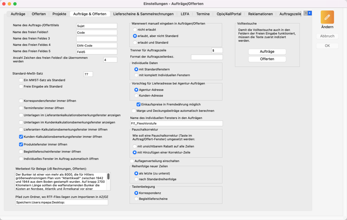 Spezialanwendung. Legen Sie hier einen Pfad fest, falls Sie vorbereitete Datenimporte für Offert-/Auftragszeilen im RTF-Format vornehmen wollen.