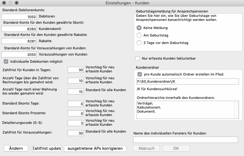 Globale Einstellungen, etwa zu den Zahlungsfristen, können später durch Einstellungen direkt im Kunden noch übersteuert werden.