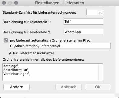 - Hier können Sie die Bezeichnungen für die beiden Telefonfelder im Adressbereich des Lieferantenmoduls umbenennen.
