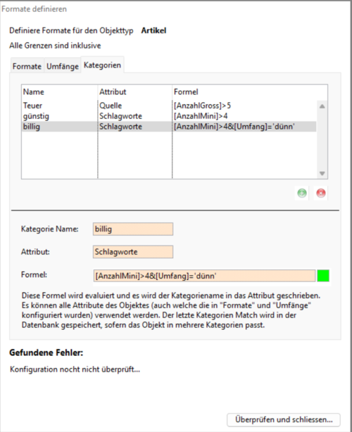 In diesem Tab können Sie Kategorien für DO-Objekte definieren. In das Attribut wird immer der Name der letzten passenden Konfiguration geschrieben. In der Formel können Sie alle Attribute des Objektes verwenden, auch diese welche in der Konfiguration der Formate und Umfänge stehen!