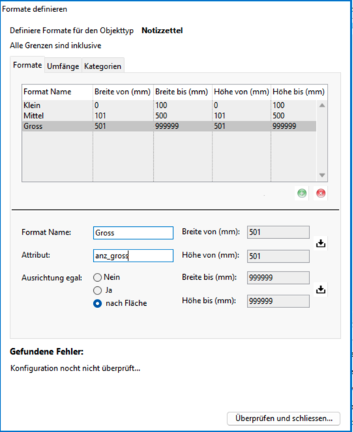 In diesem Fenster können Sie interessante Formate, Umfänge und Kategorien definieren, welche Sie messen möchten und somit in Auswertungen im Blick haben. Einige Beispiele: "Wie viele der Bücher sind dick (> 50 Seiten)", "Wie viele Seiten meines Ordners sind gross (> A3)?", "Wie viele Bücher kann ich als teuer verrechnen? (> 50 Seiten und mindestens 15 grosse Seiten)