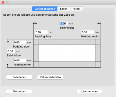 Hier haben Sie die Möglichkeit die Zellenhöhe, Zellenbreite und alle Innenabstände einzustellen. Beachten Sie, dass die Änderungen sich auf alle markierten Zellen auswirken. Zudem können Sie Zellen teilen oder aber wieder zusammenfügen.