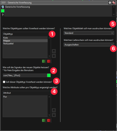 Wählen Sie hier alle Objekttypen aus, die Sie konfigurieren möchten. Sie können über “+” und “−” Objekttypen hinzufügen oder entfernen. Die Reihenfolge kann ebenfalls angepasst werden. Dies wirkt sich auf das Dropdown-Menü im “Generische Vorerfassungsfenster” aus.