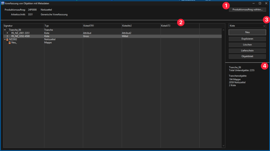 In der Hauptliste dieses Fensters werden alle Objekte des Produktionsauftrags angezeigt. Befinden sich die Objekte nicht mehr in diesem Arbeitsschritt, kann der Benutzer ihre Daten nicht mehr bearbeiten. Dies wird durch ein Schlosssymbol signalisiert. Für jedes Objekt werden die Signatur und die vorkonfigurierten Attribute in der festgelegten Reihenfolge angezeigt. Alle Werte sind direkt in der Liste editierbar – mit Ausnahme der Signatur, sofern keine freie Benutzereingabe (”*”) konfiguriert wurde.