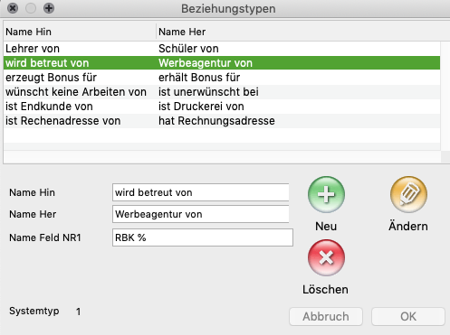 Dieses Fenster erreichen Sie unter «Einstellungen -> Tabellen -> Grundeinstellungen -> Beziehungstypen».