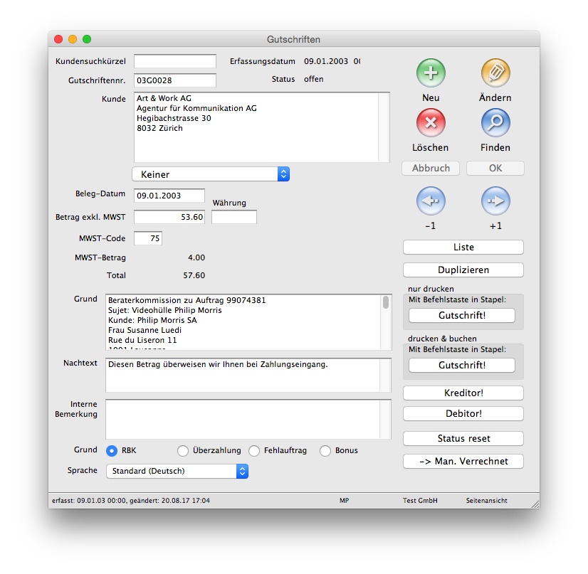 - Klicken Sie hier, um die Gutschrift zu duplizieren. Es werden alle Werte übernommen, die Sie noch anpassen können.