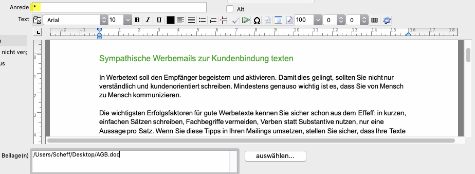 Abbildung: Beispiel einer Vorlage für die Serien-E-Mail-Funktion mit Beispielsdaten