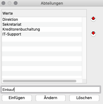 Hier können Sie Vorschläge für Abteilungen erfassen, die Sie Ansprechpersonen im entsprechenden Eingabefeld mittels Help-Taste zuordnen können.