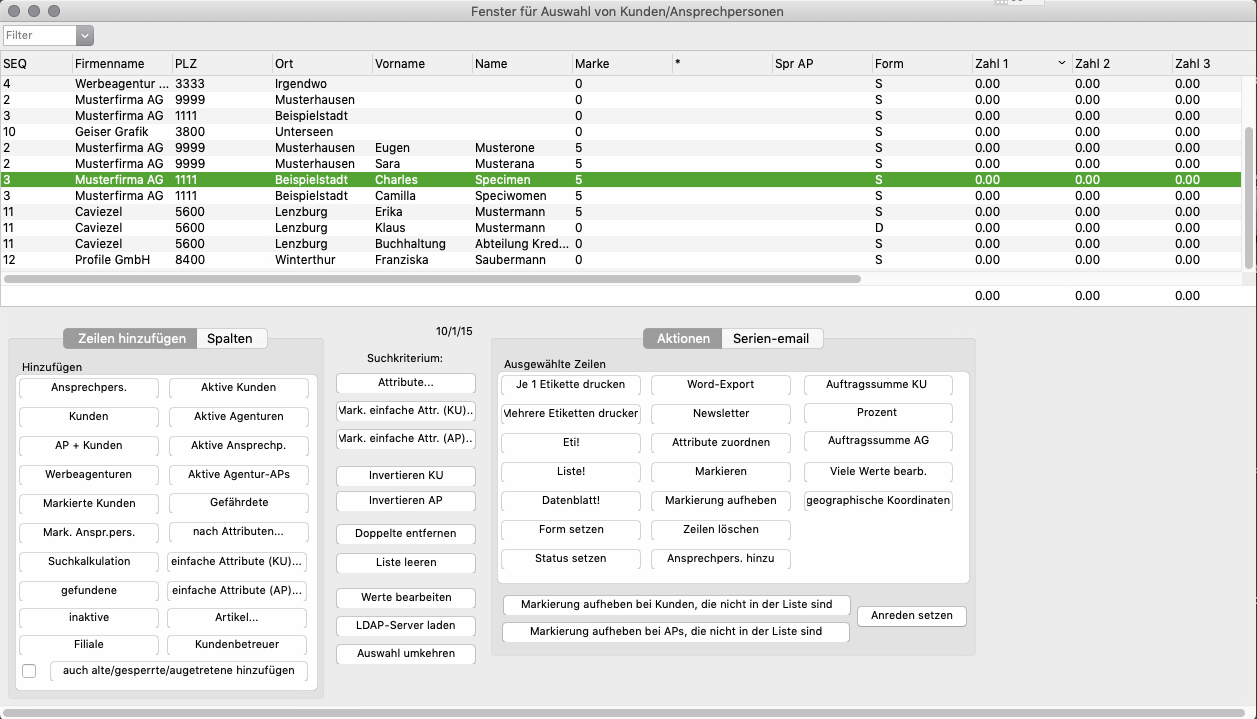Fügt der Liste sowohl alle Ansprechpersonen wie Kunden hinzu. Hat ein Kunde Ansprechpersonen, wird der Kunde allein (ohne AP) nicht in die Liste geladen. Hat er keine Ansprechpersonen, wird er in die Liste geladen. Diese Taste ist in den meisten Fällen, die bessere Wahl als die Tasten «Ansprechpersonen» oder «Kunden».