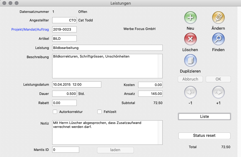 Hier können Sie Leistungen Ihrer Angestellten für ein bestimmtes Projekt oder einen Auftrag erfassen und später in eine Auftragszeile übernehmen.