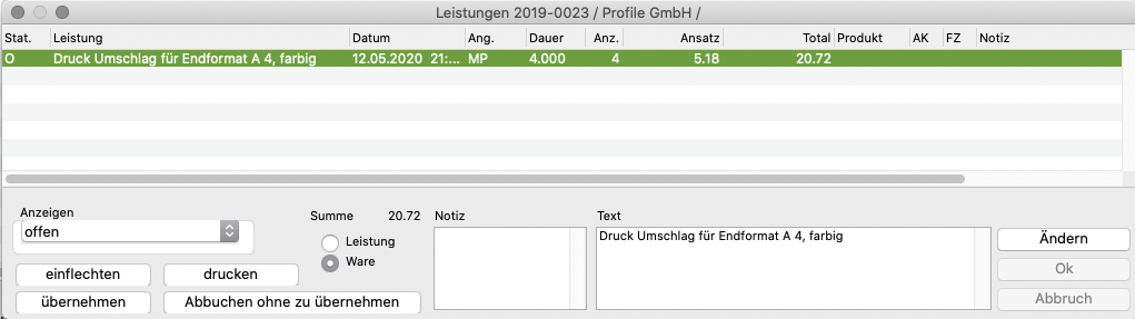 - Übernimmt die angewählten Leistungen in den Auftrag.