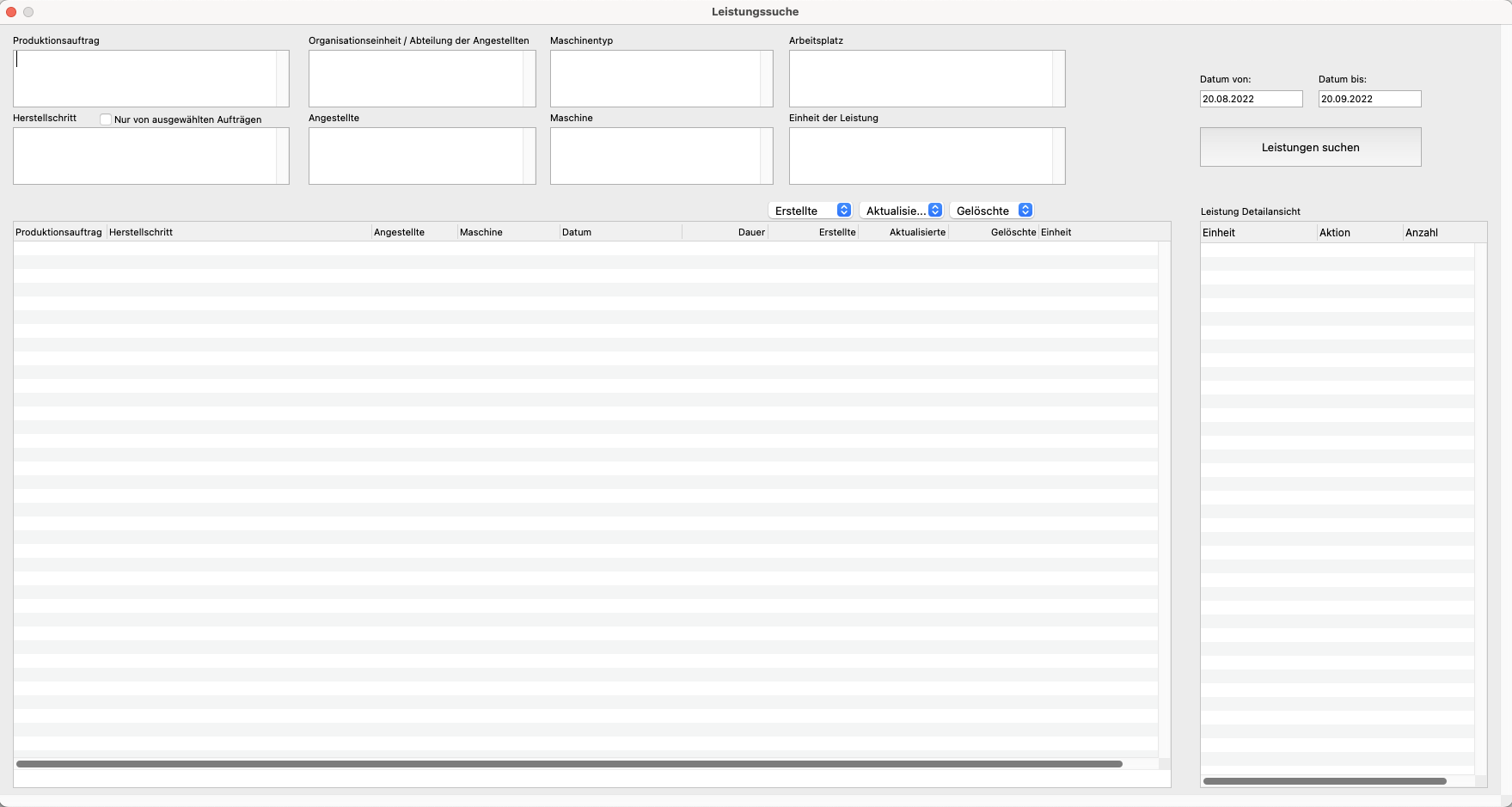 Die beiden Filter grenzen auf bereits ausgewählte Produktionsaufträge und / oder Herstellschritte ab. Es werden nur noch die Leistungen angezeigt, welche den hier getroffenen Filterkriterien entsprechen.