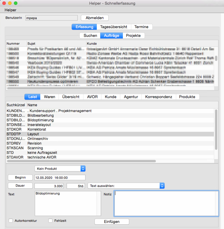 Hier können Ihre Angestellten die für sie relevanten Informationen zu den laufenden Aufträgen einsehen und erbrachte Leistungen und verwendete Materialien, wie Plots und Filme für die spätere Verrechnung in den Auftragszeilen vorerfassen.