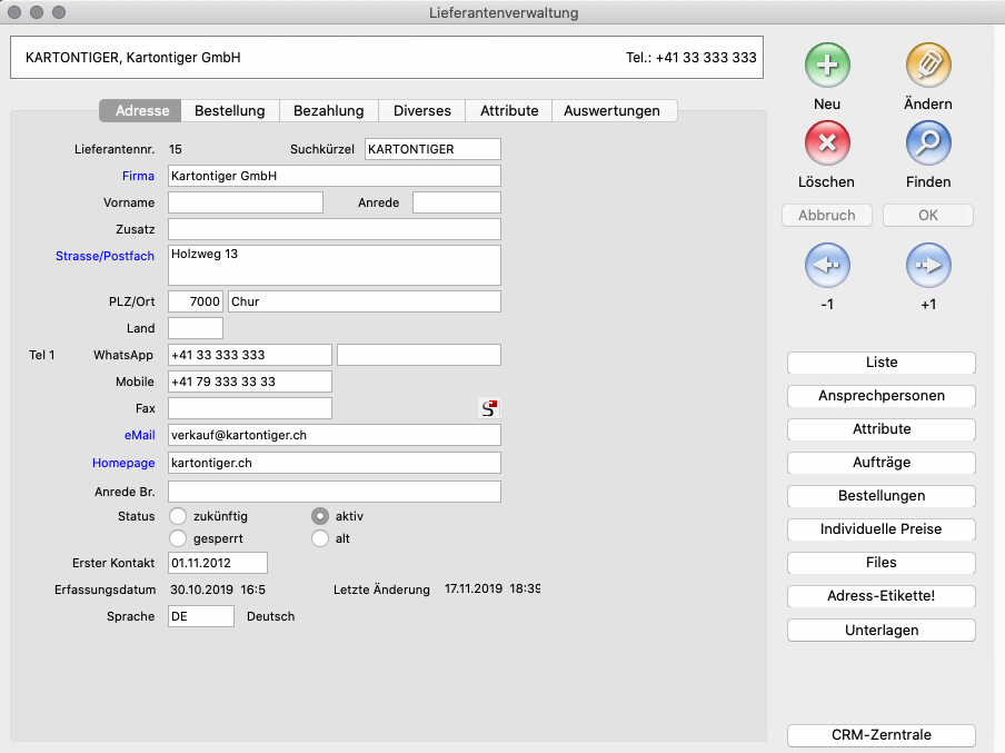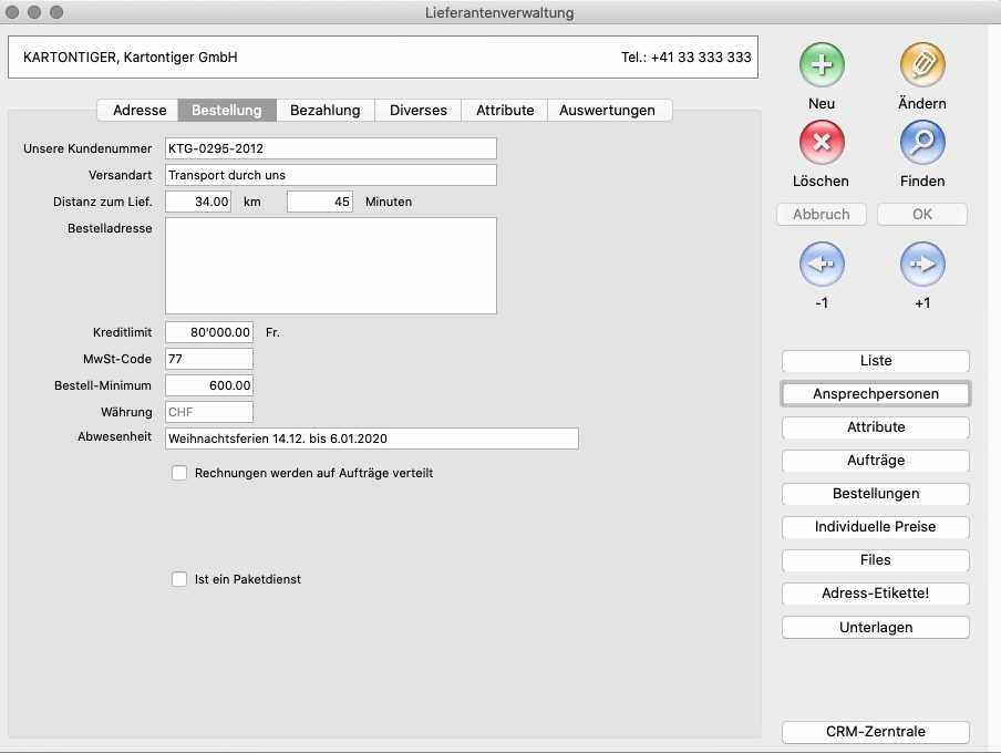 - Allgemeine E-Mail-Adresse wie «info@lieferant.ch» (optional, da E-Mail-Adressen direkt den Ansprechpersonen hinterlegt werden können)