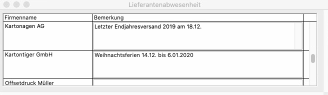 Hier können Sie informative Abwesenheitsnotizen (Betriebsferien, Erreichbarkeit über Festtage usw.) zu den Lieferanten eintragen und einsehen.
