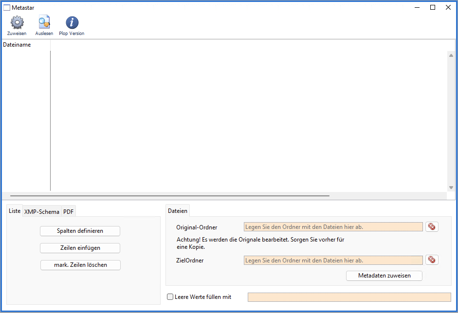 MetaStar ermöglicht das einfügen von eigenen Metadaten in Bilddateien (EXIF) oder PDFs. Für PDFs können eigene XMP-Schemas erstellt werden.