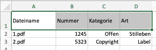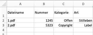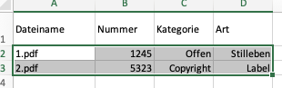 Die erste Spalte enthält den/die zugehörigen Dateinamen und sollte die Überschrift "Dateiname" erhalten. Die folgenden Spalten stehen für die Metadaten. Die Spaltenüberschriften hier entsprechend dem gewünschten Meta Tagnamen füllen, die Zeilen darunter mit den entsprechenden Werten.
