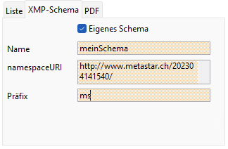 Um eigene XMP Schemas hinzuzufügen, muss hier entsprechend die Checkbox ausgewählt und die Felder mit den Schemadaten befüllt werden.