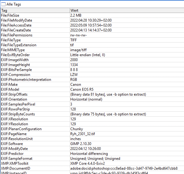 Die Tagnamen setzen sich mit einem Doppelpunkt getrennt aus dem Typ (EXIF, XMP, IPTC, ICC_Profile, Composite) und dem gesuchten Wert zusammen.