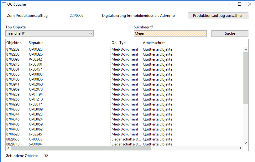 Fenster, welches das durchsuchen zuvor gespeicherter OCR Daten erlaubt. Zeigt alle Objekte an, in welchen der Suchbegriff vorkommt.