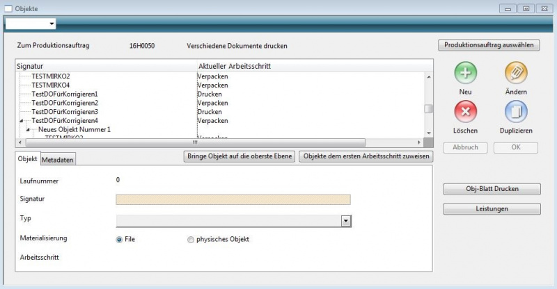 In dieser Maske hat der Benutzer die Möglichkeit Objekte/DO zu bearbeiten resp. zu erstellen. Es besteht die Option eine Hierarchie innerhalb der Objektstruktur zu machen. Hierbei müssen Objekte/DO auf andere Objekte/DO „gedroppt“ werden. Mit den dazugehörigen Tasten unter der Liste kann der Benutzer gewünschte Objekte/DO auf die oberste Ebene setzen oder spezifischen Objekten den ersten Arbeitsschritt/HZ zuweisen.