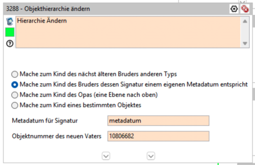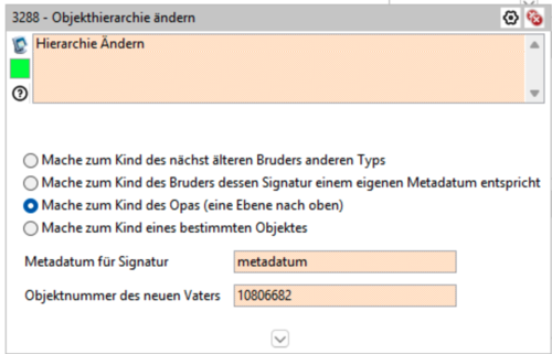 In diesem Fall wird das Objekt zu einem Kind eines spezifisch definierten Vaters. Dazu geben Sie eine Objektnummer im Konfigurationsfenster an. 0 ist auch ein gültiger Wert; Dadurch landet das Objekt auf der obersten Ebene der Projekthierarchie.