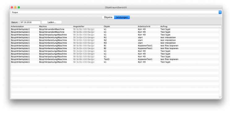 Im Tab Leistungen sieht man alle Leistungen, die am gewählten Datum von Angestellten dieser OE oder an Maschinen dieser OE geleistet wurden.