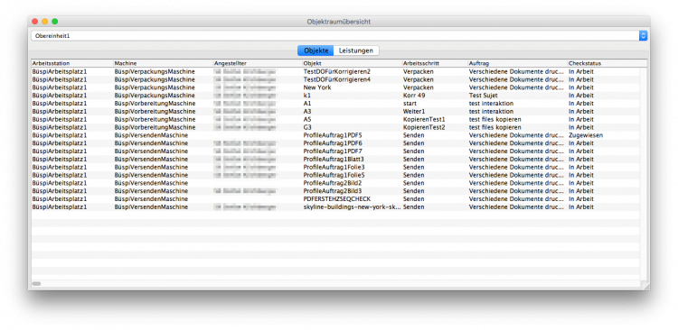 In diesem Fenster hat man eine Übersicht welche Objekte an welchen Arbeitsplätzen, an welchen Maschinen und von welchen Angestellten in einer Organisationseinheit (OE) bearbeitet werden.