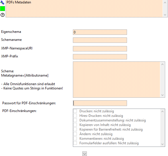 Wenn Sie Einschränkungen für PDFs nutzen wollen, müssen Sie ein Passwort im Feld eingeben. Wenn Sie kein Passwort festlegen sind die Einschränkungen nicht gültig.