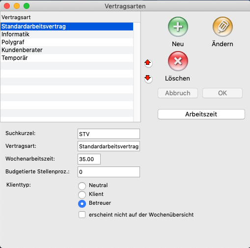 Hier erfassen Sie die Vertragsarten für Angestellte.