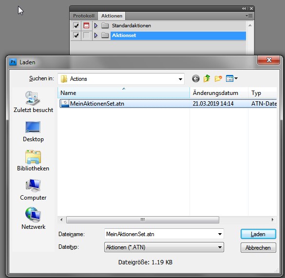 7. Die gespeicherte Datei <Aktion.atn> auf dem Jobserver in Photoshop importieren/laden
