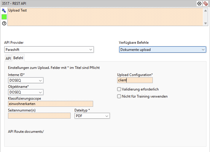 Objektname - Der Name für das Objekt, wird auf der Parashift Webseite entsprechend zur identifikation verwendet. Verwendet Platzhalter, erlaub sind [DOSEQ], [DOSIGNATUR] und [FILENAME]