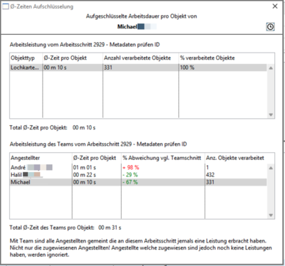 In der oberen Liste sehen Sie alle Objekttypen aufgelistet, an welchen der Angestellte am zugewiesenen Arbeitsschritt gearbeitet hat. In der unteren Liste sehen Sie eine Aufschlüsselung des Teamschnitts. Mit Team sind alle Angestellten gemeint die an diesem Arbeitsschritt jemals eine Leistung erbracht haben. Nicht nur die zugewiesenen Angestellten! Angestellte welche zugewiesen sind jedoch noch keine Leistungen haben, werden ignoriert.