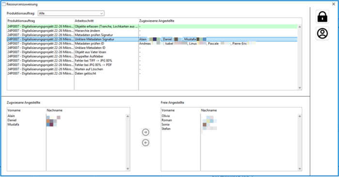 In diesem Modus sehen Sie alle Arbeitsschritte aller geplanten Produktionsaufträge. Sie können die Hauptliste mithilfe des "Produktionsauftrag"-Dropdowns Filtern. Um eine Änderung vorzunehmen, wählen Sie einen Arbeitsschritt und klicken das Schlosssymbol. Es dient wie der klassische Ändernbutton im Helper. Mithilfe der Pfeiltasten können Sie Freie Angestellte zuweisen oder die Zuweisung wieder aufheben.