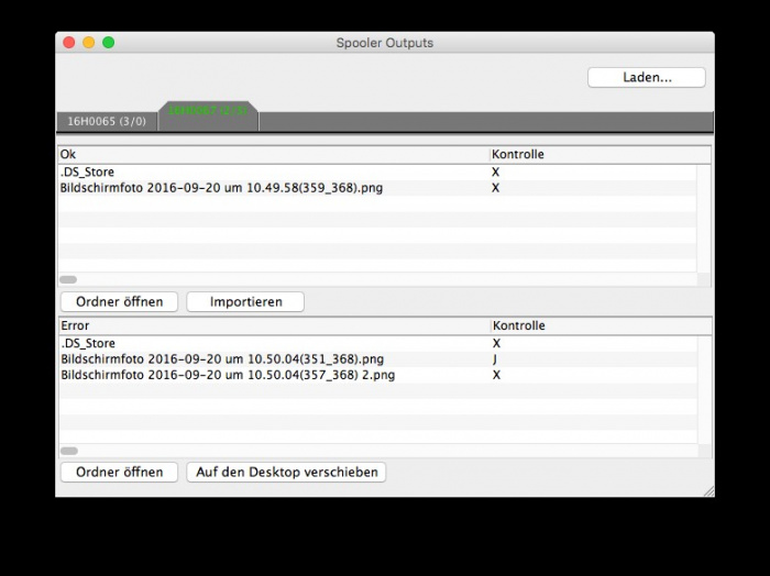 In dem Fenster hat es zwei Listen. In der Ok-Liste werden alle Dateien des aktuellen Auftrags, die erfolgreich bearbeitet wurden (HZ_OUTPUTPFAD) und in der Error-Liste werden die Dateien angezeigt, bei denen es Probleme gab (HZ_ERRORPFAD). Unter der Ok-Liste kann man die Dateien wieder Importieren und damit die Files zurück in die Helper-Ordner-Hierarchie kopieren und zum nächsten Arbeitsschritt übergehen. Die fehlerhaften Dateien kann man Auf den Desktop kopieren um sie dort manuell zu bearbeiten.