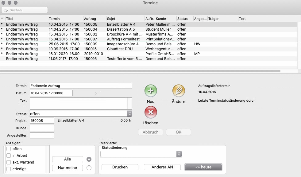 Abbildung: Fenster «Termine» mit Beispielsdaten