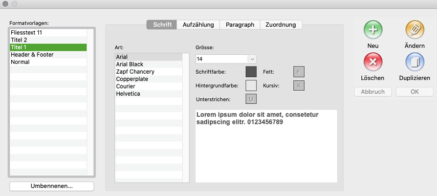 Dieses Fenster erreichen Sie unter «Einstellungen -> Tabellen -> Text -> Formatvorlagen».