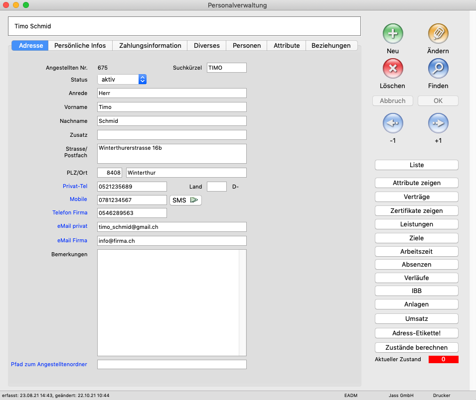 Abbildung: Fenster «Personalverwaltung» mit Beispiels-Adressdaten