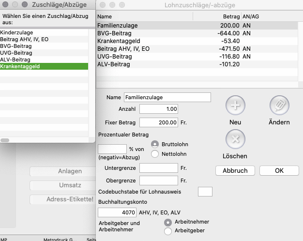 - Mittels Mausklick wird ein Fenster geöffnet, in welchem Sie Lohnabzüge und Zuschläge erfassen können (AHV, Kinderzulagen usw.).