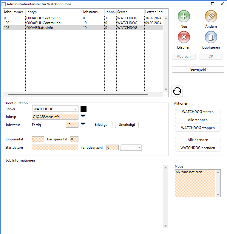 Jede Watchdog Arbeitsstation muss mit Watchdog Jobs konfiguriert werden. Das Administrationsfenster ist deshalb ebenfalls fast identisch den dem für die Serverjobs.