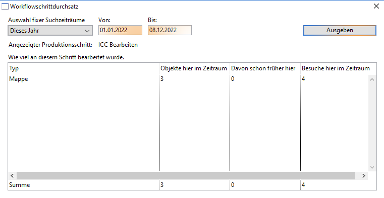 Objekte vom Typ Mappe, waren im Zeitraum 01.01.2022-03.12.2022 genau drei Stück beim Schritt 'ICC Bearbeiten'. Spalte 1 = 3